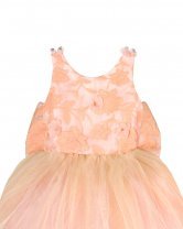 Girl's dress with tulle on the skirt, blouse with embroidered tulle details, large bow on the back with 3D flower embroidery and pearls.
