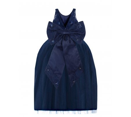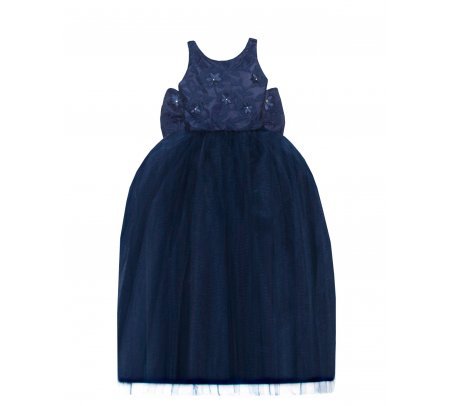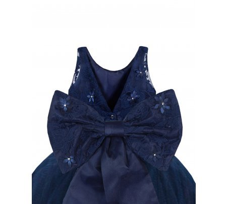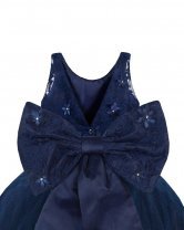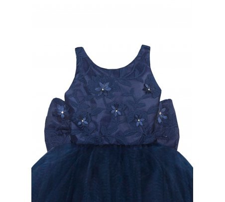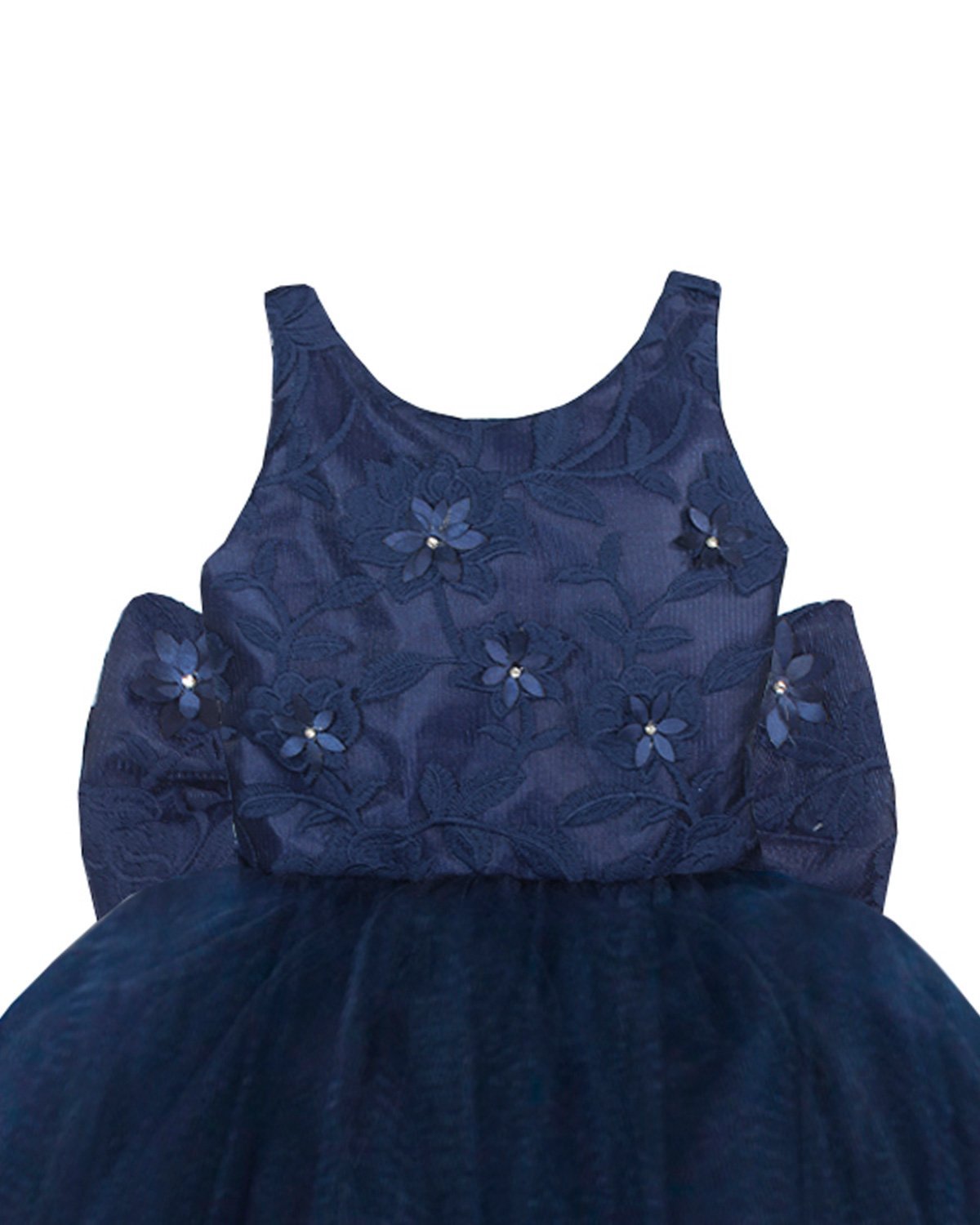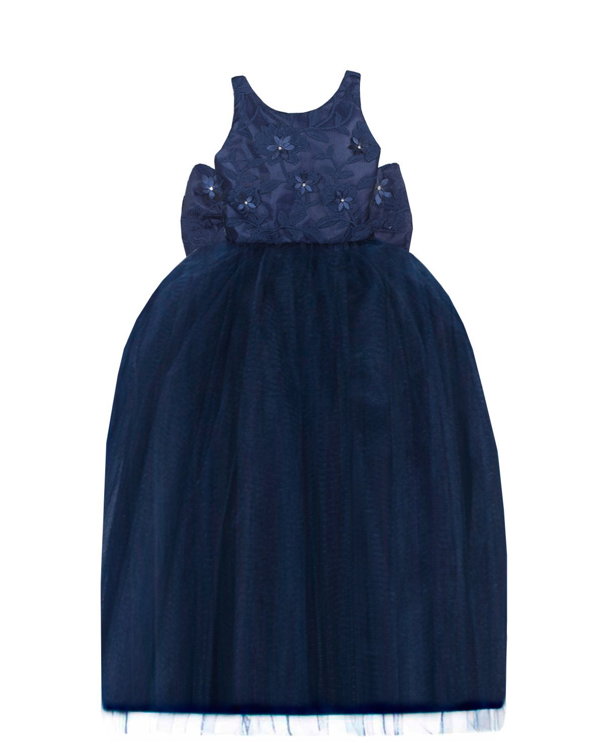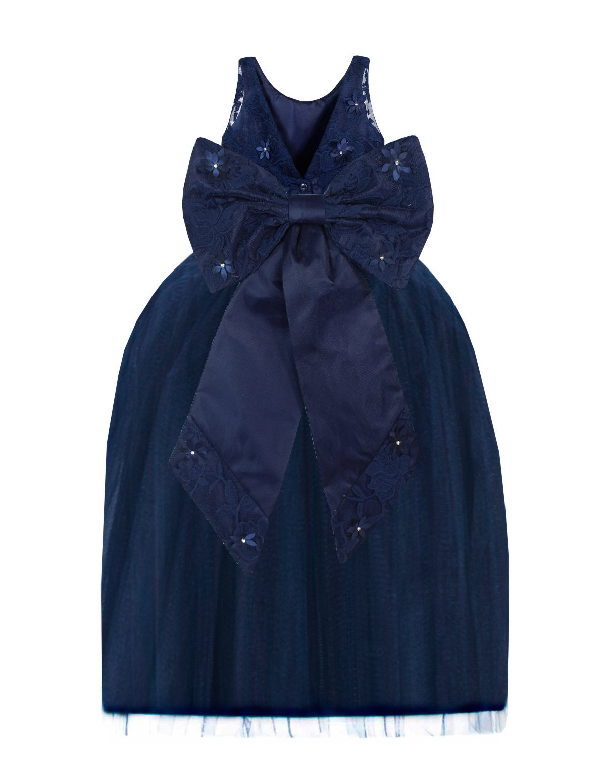 Girl's dress with tulle on the skirt, blouse with embroidered tulle details, large bow on the back with 3D flower embroidery and pearls.
