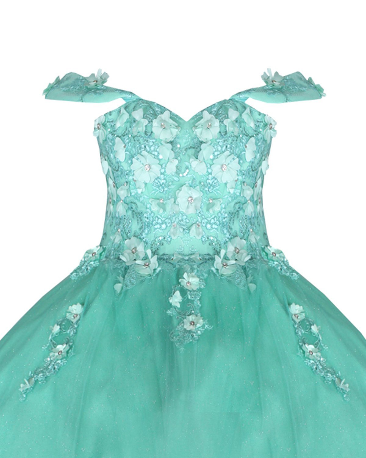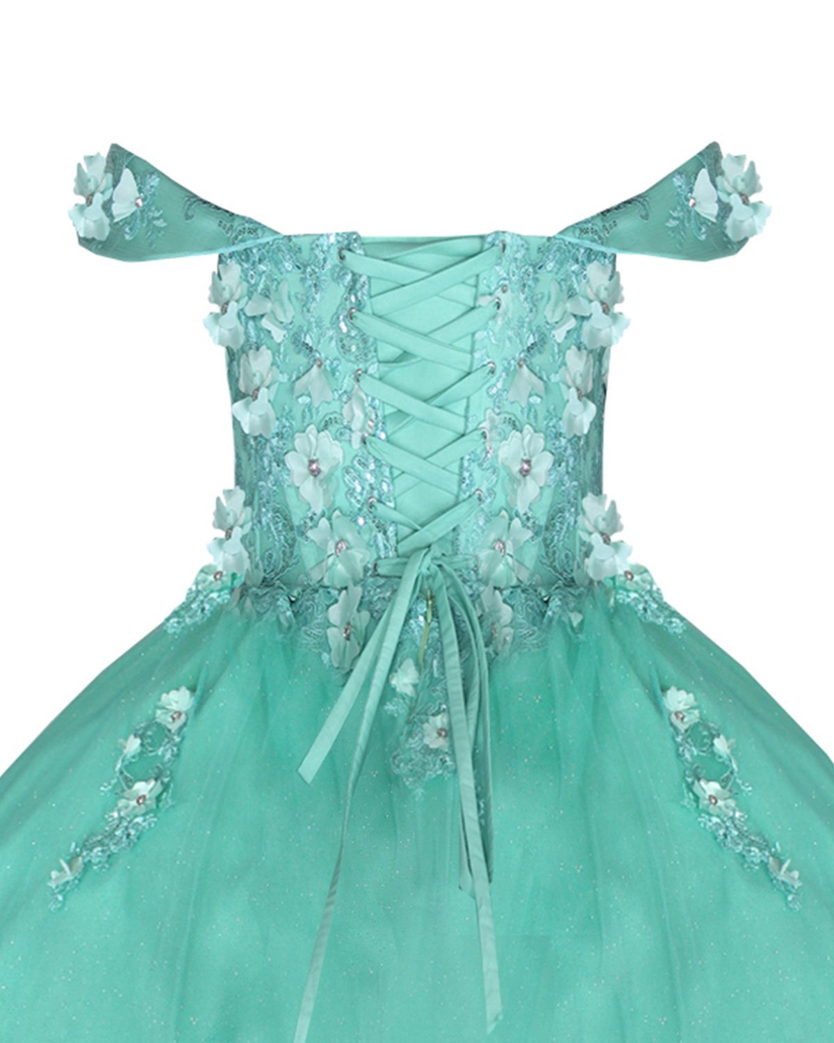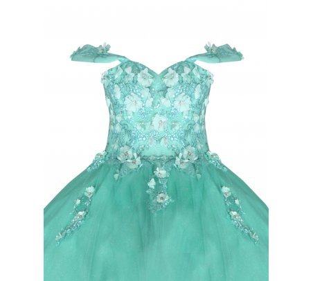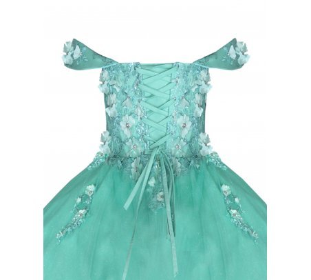 Quinceañera dress made of tulle with a beaded and 3D embroidered corset, skirt with 3D embroidery at the waist and a circular princess-like fall.