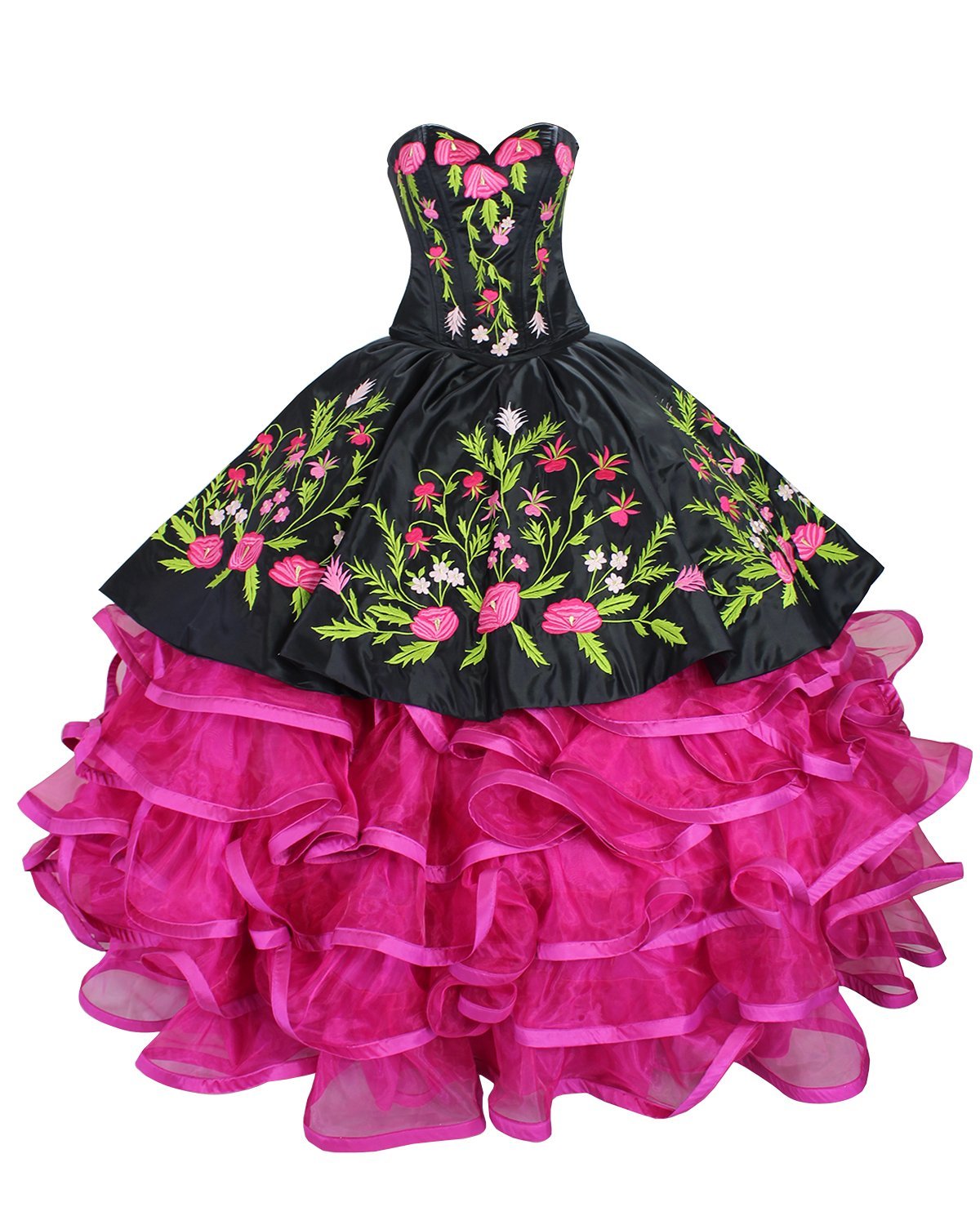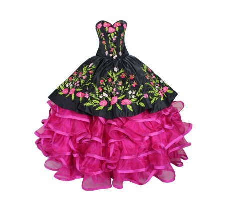 Quinceañera dress with beaded and sequin corset, skirt with scalloped edges and train decorated with beadwork, pearls, and sequins.