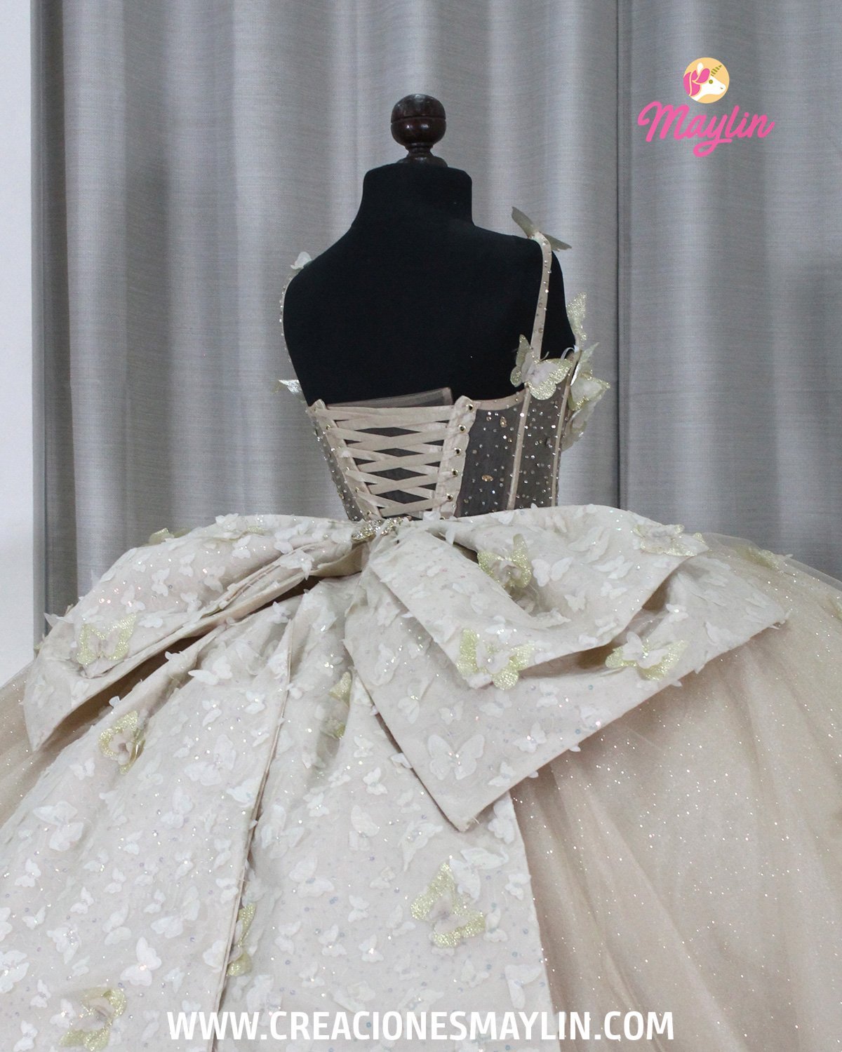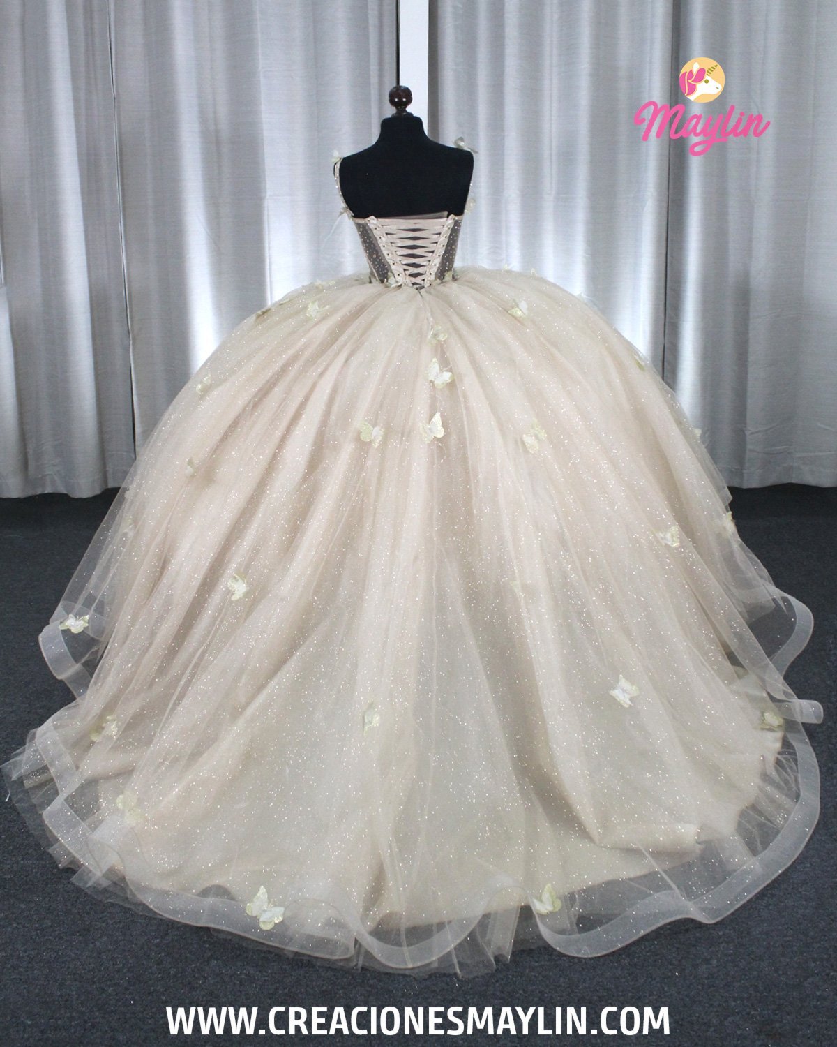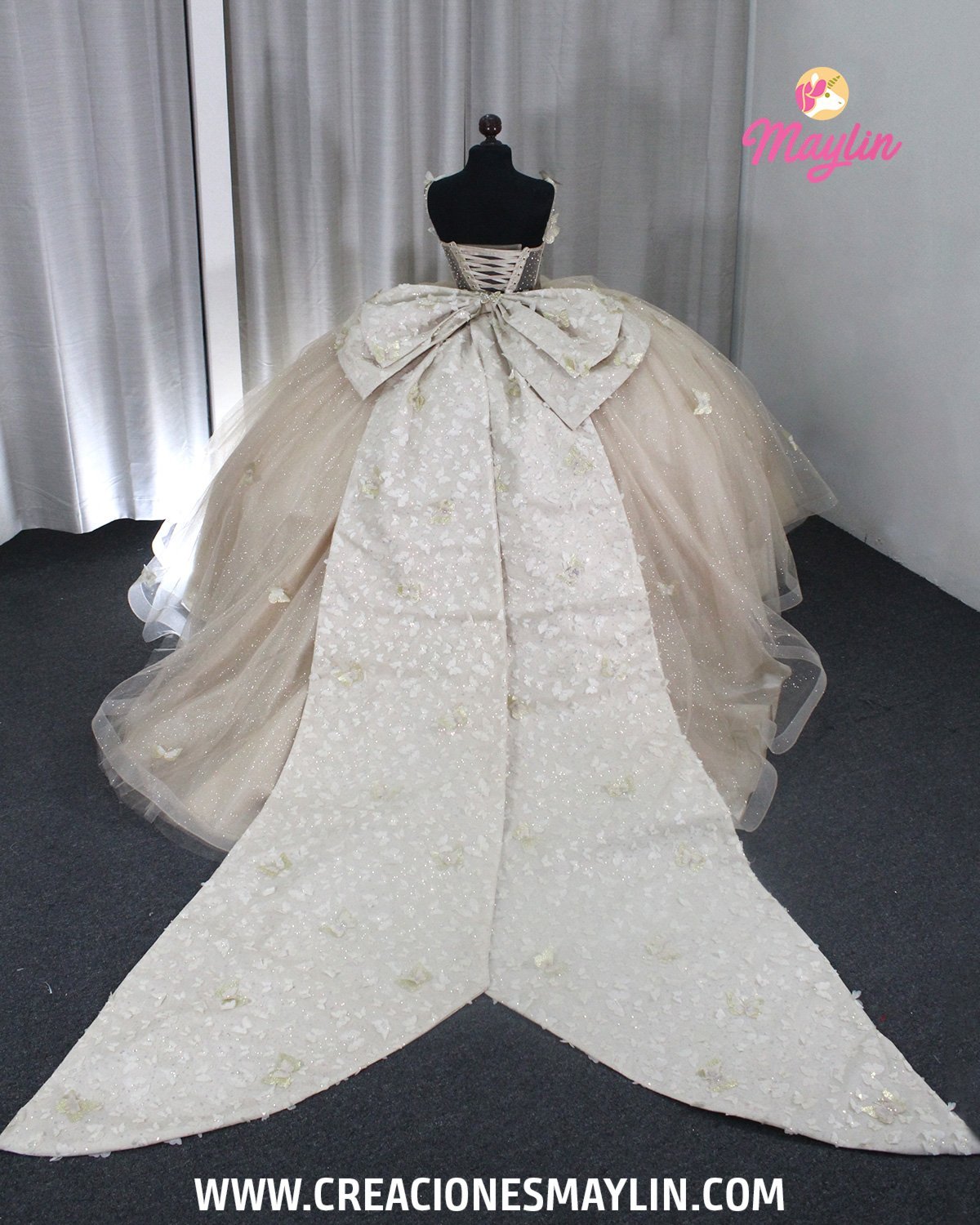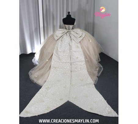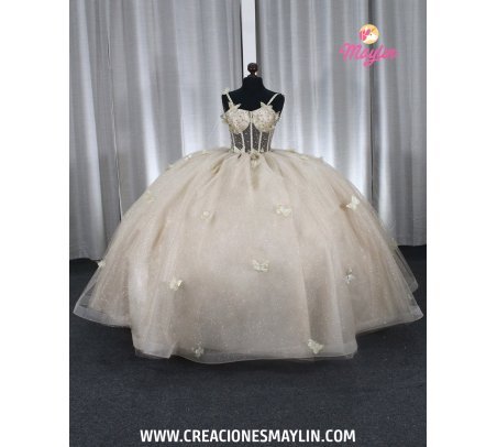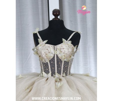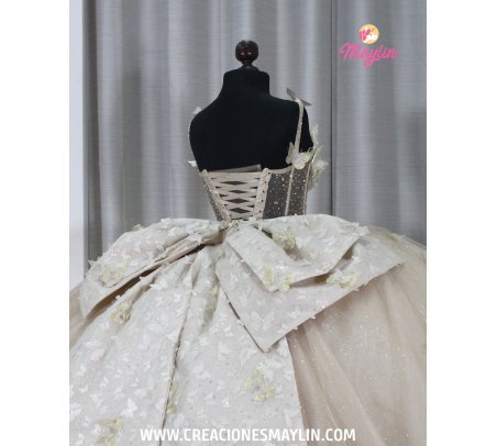 Quinceañera dress made of tulle with a 3D butterfly corset, transparency and beads, skirt with 3D butterflies, train, and removable bow.
