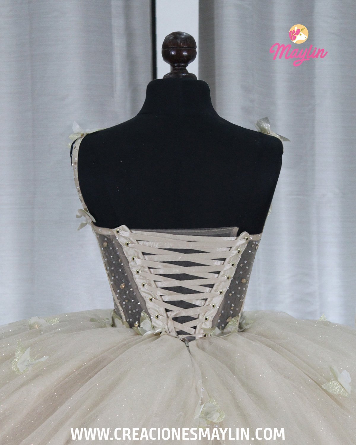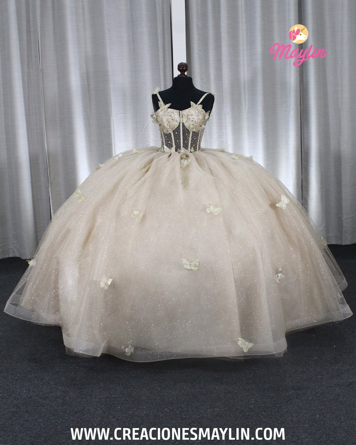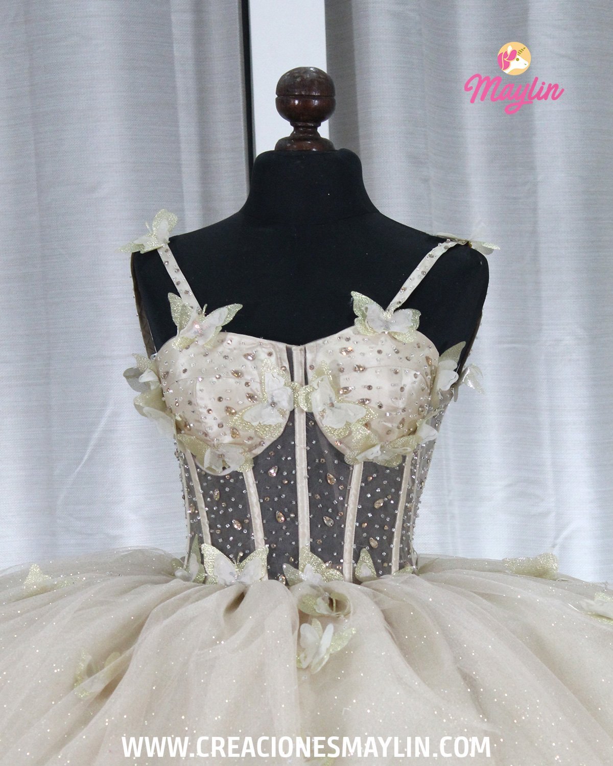 Quinceañera dress made of tulle with a 3D butterfly corset, transparency and beads, skirt with 3D butterflies, train, and removable bow.