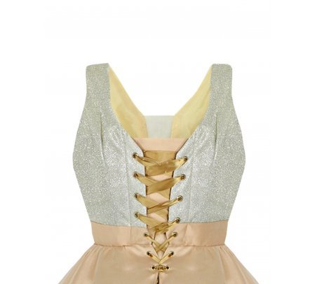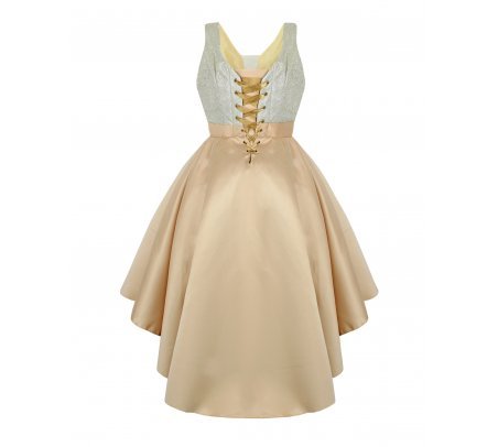 The train-adorned skirt adds a touch of glamour, while the blouse features an elegant corset finish at the back. This dress not only follows youthful trends but also incorporates classic elements for a unique and sophisticated look.