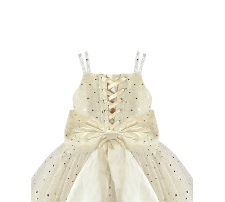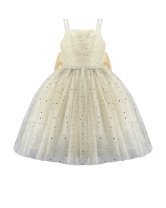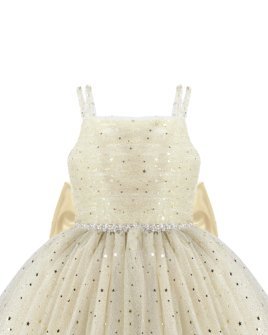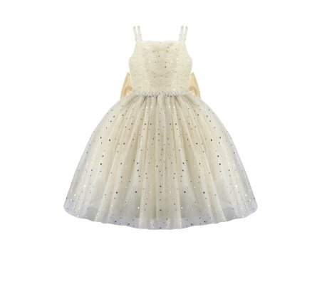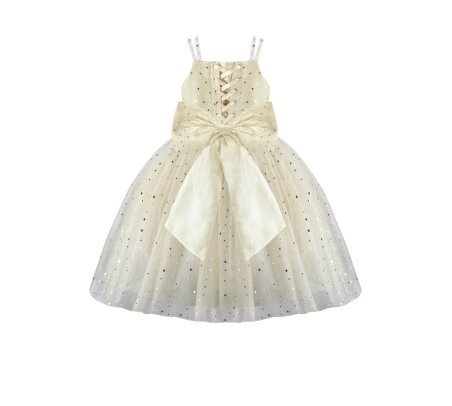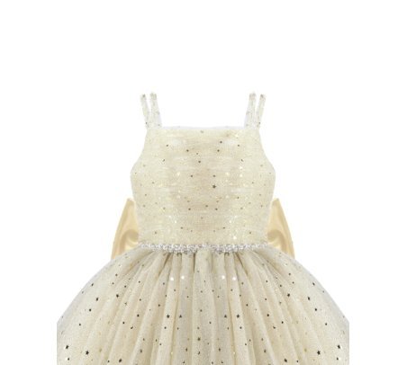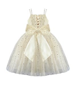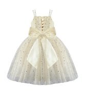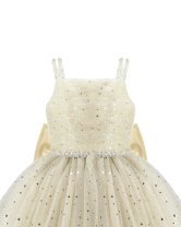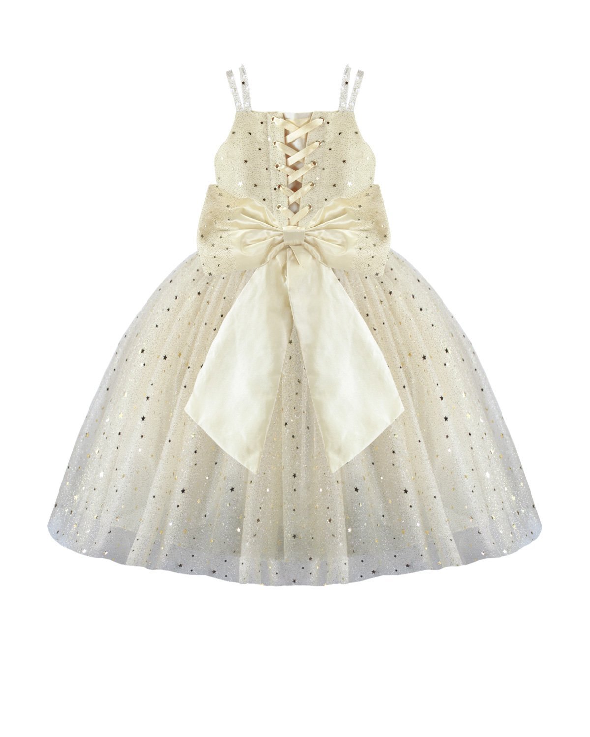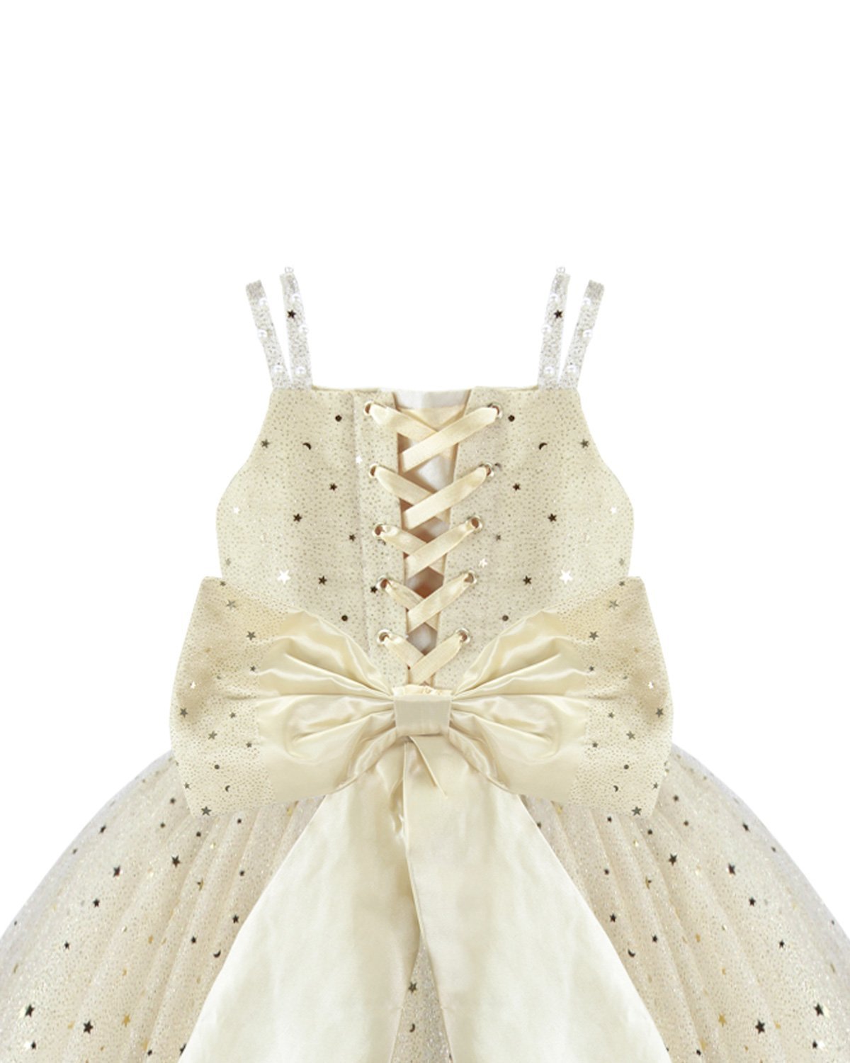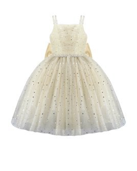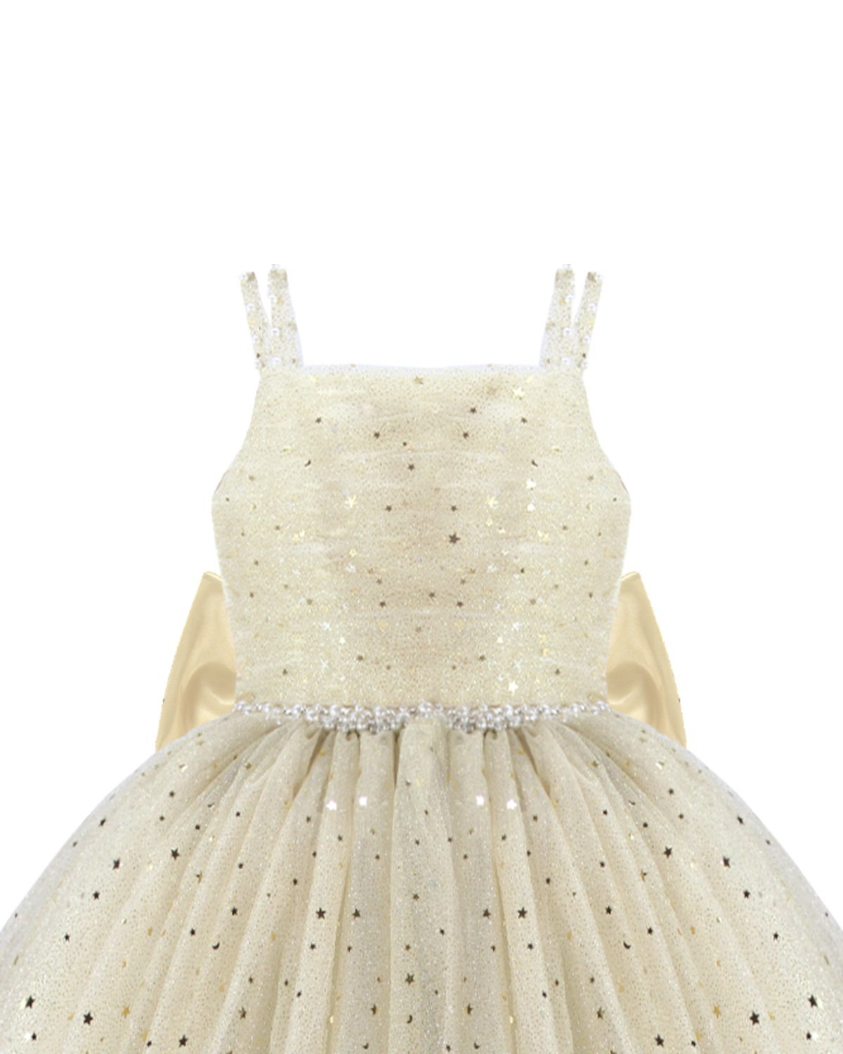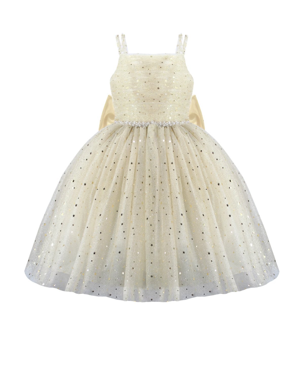 Estrella Youth Dress, featuring a 3/4 glitter tulle skirt, lace-up corset, pearl-adorned straps, and a decorative back bow. Perfect for special occasions.