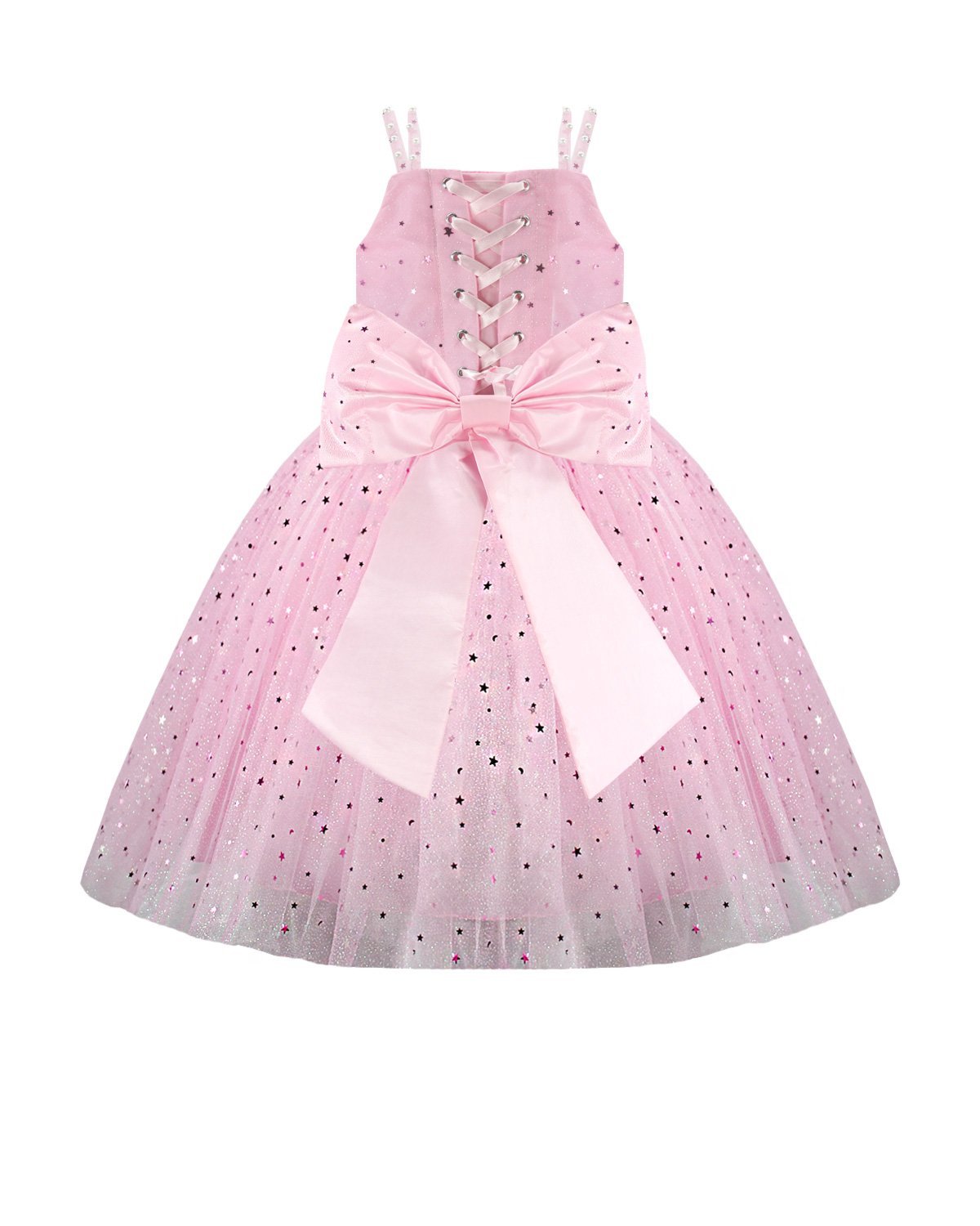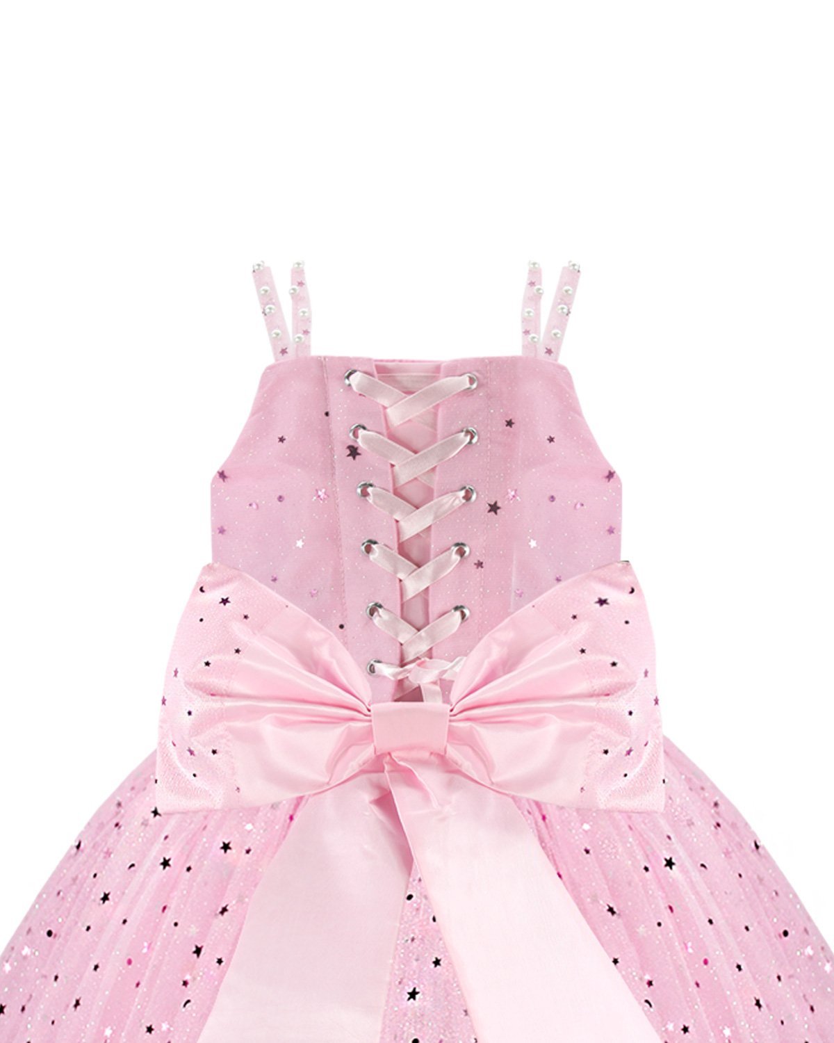 Estrella Youth Dress, featuring a 3/4 glitter tulle skirt, lace-up corset, pearl-adorned straps, and a decorative back bow. Perfect for special occasions.