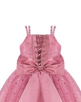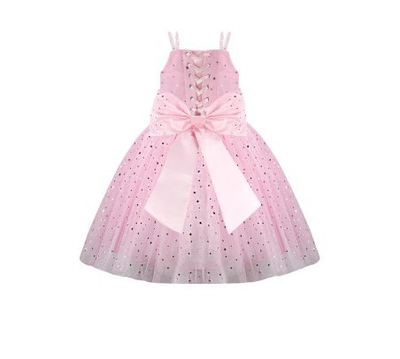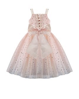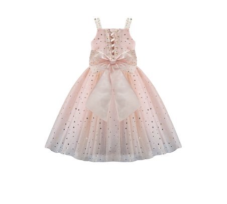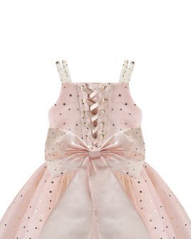 Estrella Youth Dress, featuring a 3/4 glitter tulle skirt, lace-up corset, pearl-adorned straps, and a decorative back bow. Perfect for special occasions.