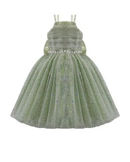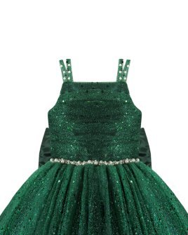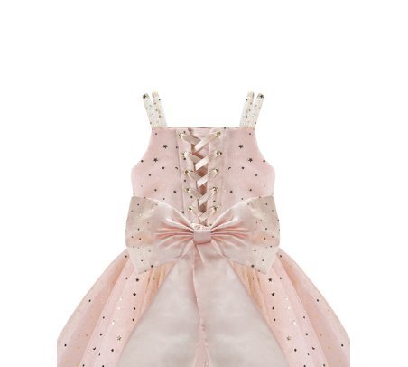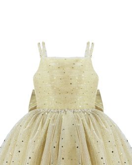 The Estrella Youth Dress is the perfect choice to stand out at any special occasion. Its elegant design features pearl-adorned straps and a sophisticated square neckline. The 3/4 skirt, crafted with multiple layers of glitter tulle, adds volume and a spectacular sparkle. At the back, a lace-up corset ensures a perfect fit, complemented by a large decorative bow for a refined touch. The waist is accentuated with a delicate rhinestone belt that enhances its unique design. Ideal for parties, weddings, or formal events.
