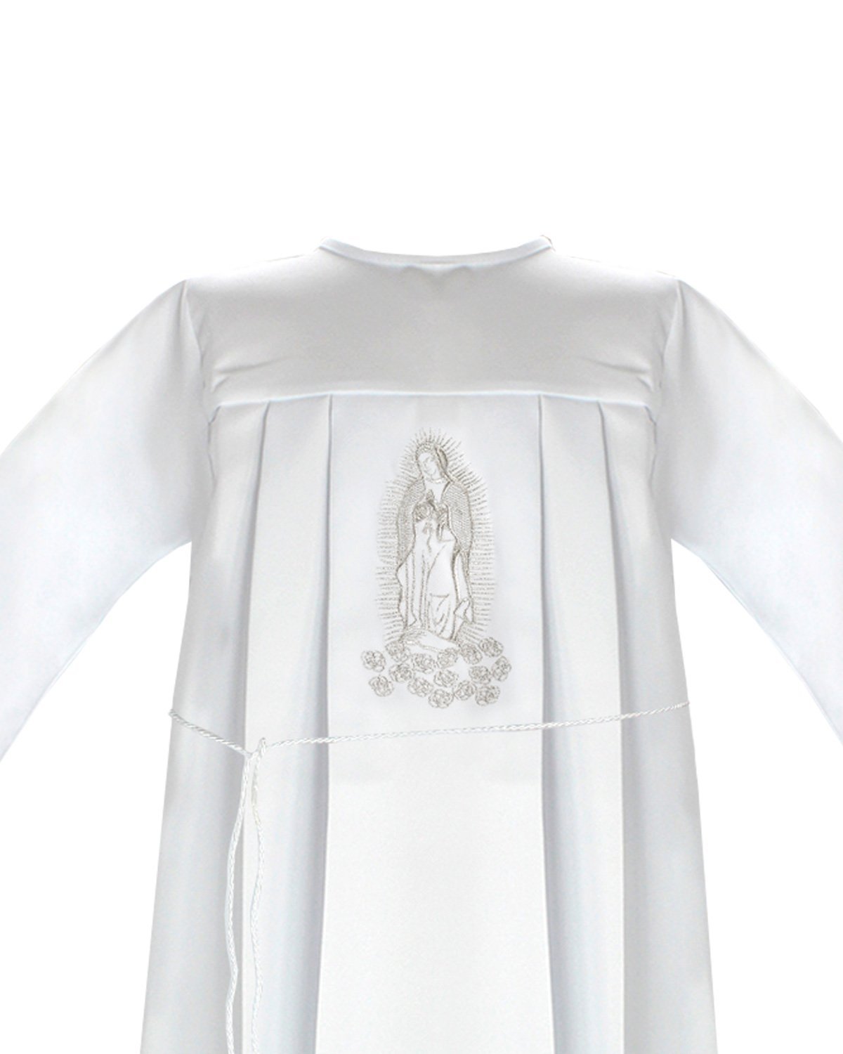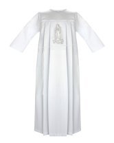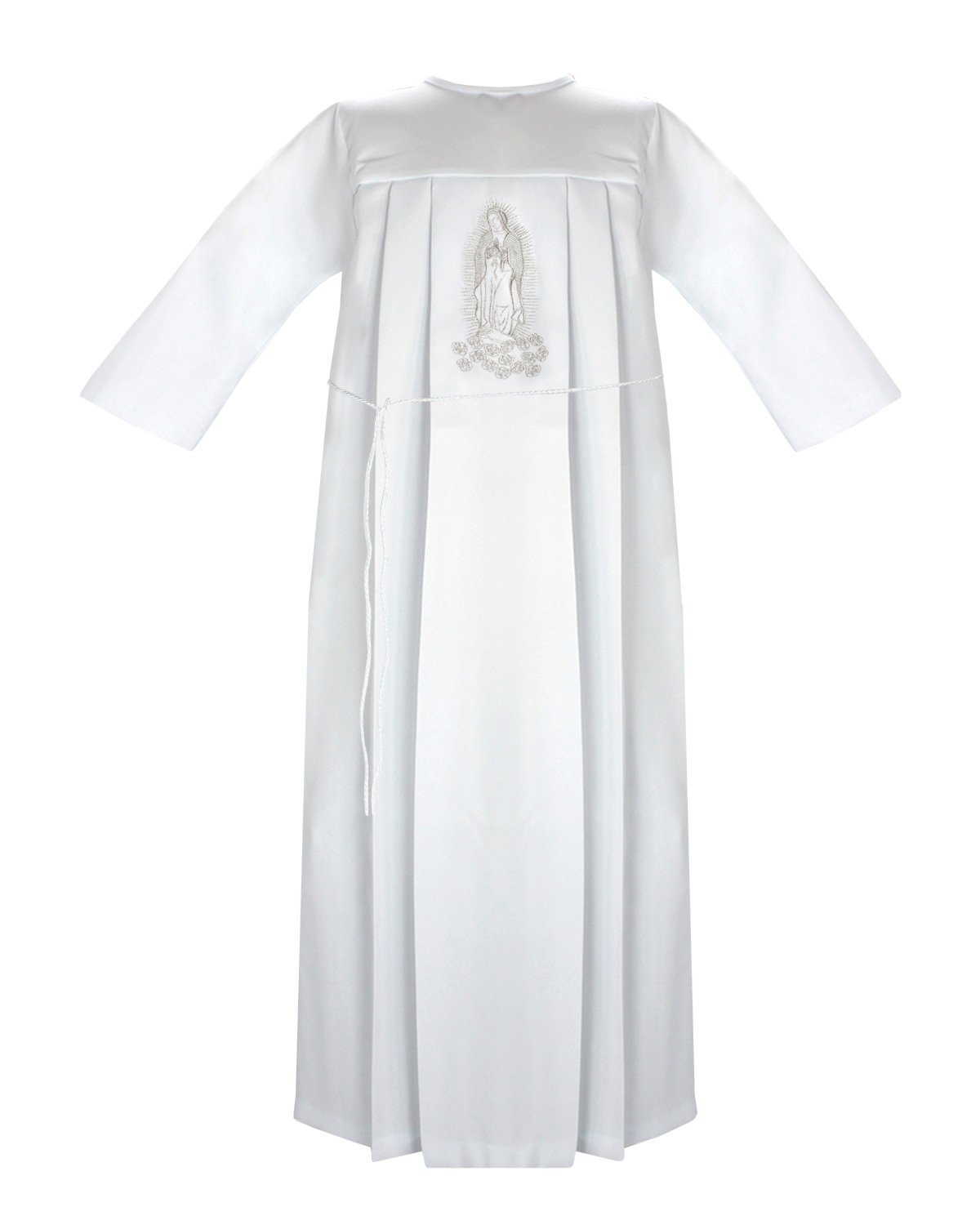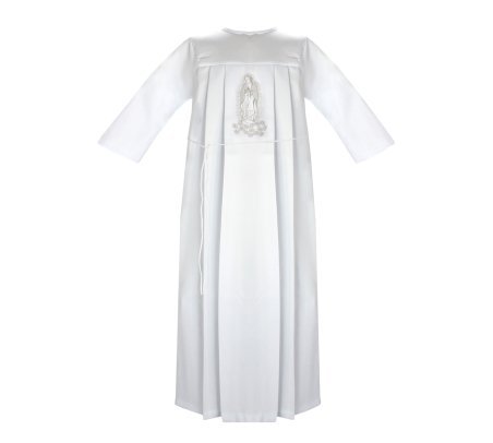 Unisex First Communion Tunic with embroidery of the Virgin on the front and sash, perfect for boys and girls. Available in multiple sizes, ideal for the occasion.