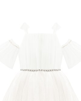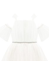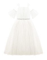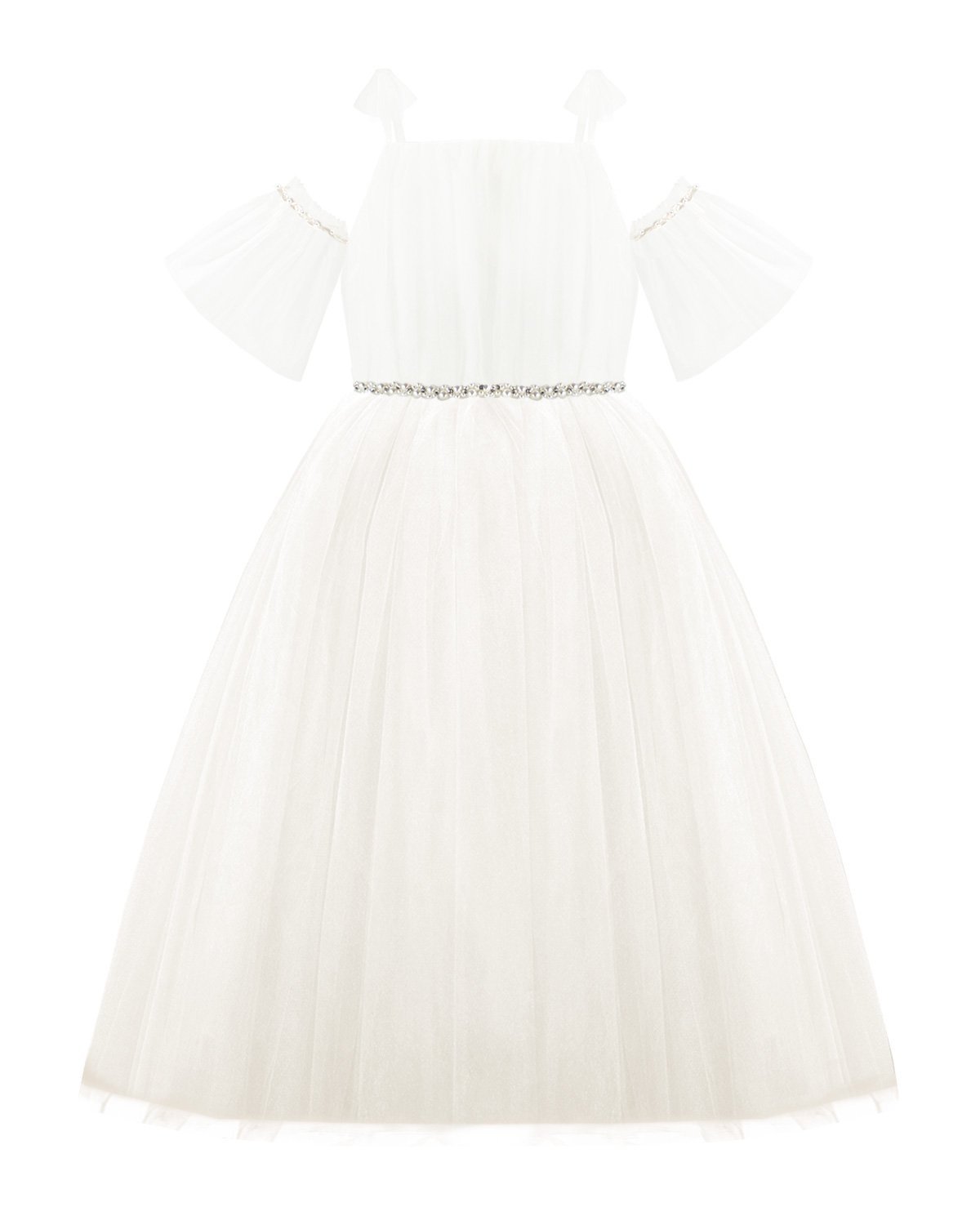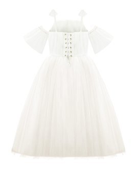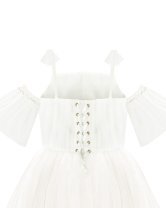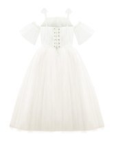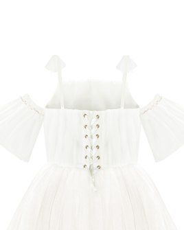 First communion dress made of tulle with lining, draped bodice, straight neckline, corset back, thin straps, and a tulle bow.