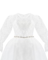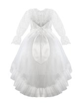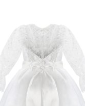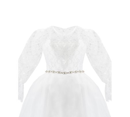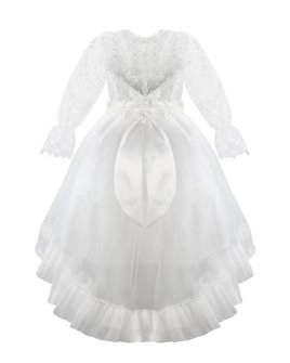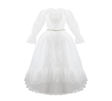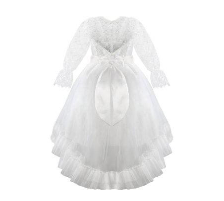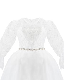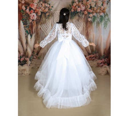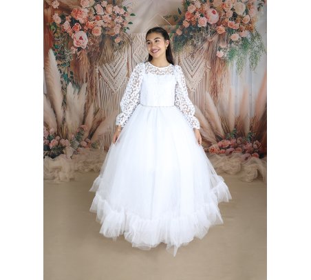 Vestido de primera comunión confeccionado en tul, con bordados, blusa de manga larga y escote de corazón. Falda circular con cauda y olanes en todo el contorno.