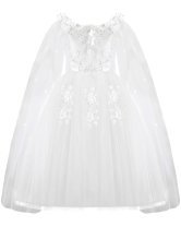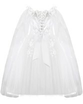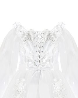 First Communion dress Model Paty with 3D flower, matching lining and veil, and sleeves adorned with small 3D flowers. Elegance and charm for unforgettable moments.