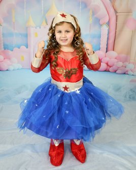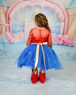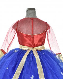 Este disfraz de mujer maravilla para niña es una opción increíble para Halloween o cualquier ocasión especial. El velo y la tafeta crean un acabado elegante y duradero, mientras que las mangas de velo delicado aportan un toque de encanto adicional. La falda adornada con estrellas pequeñas le da un estilo único que realmente la hará destacar entre la multitud. Incluye botas y una diadema para completar el look.