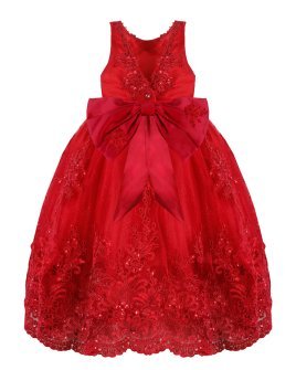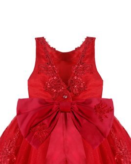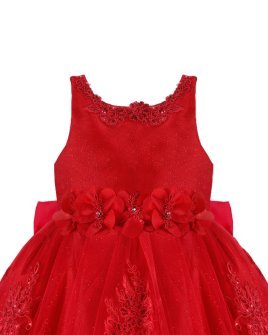The Romina Dress is a stunning princess-cut gown designed to make any girl shine on her special day. The bodice is crafted from taffeta and features elegant embroidered details, complemented by handmade floral appliqués adorned with pearls and zirconia stones around the waist. The back has a sophisticated V-cut neckline, finished with a large embroidered taffeta bow. The skirt is made of layered tulle and glitter tulle, decorated with embroidered medallions for an extra touch of elegance. Perfect for first communions, formal events, or presentations.